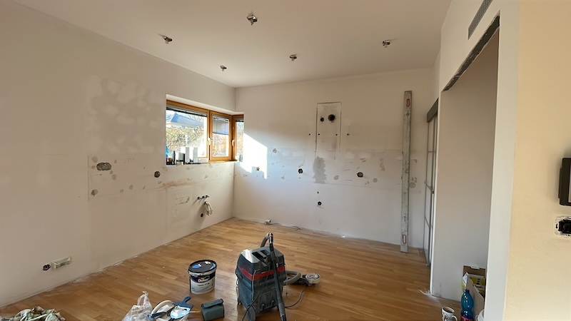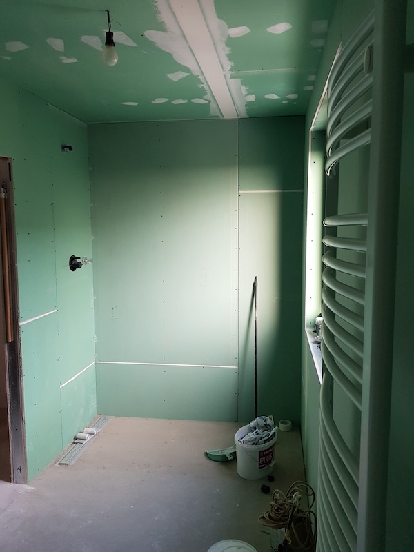 Výstavba koupelny v dřevostavbě s odtokovým žlabem v podlaze bez použití vaničky.